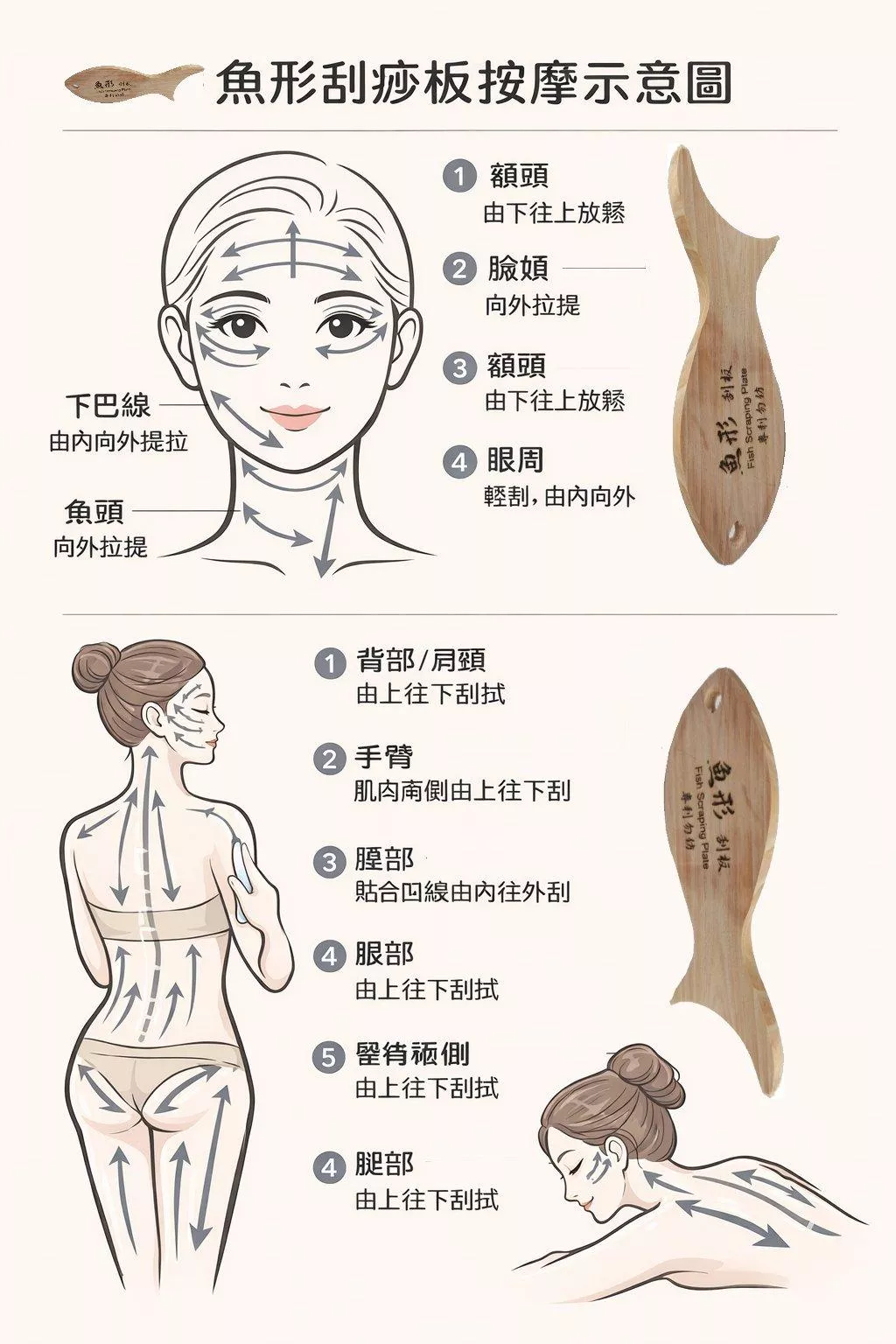 •選擇適合臉部的刮痧板,通常以圓滑且適合掌握的小型工具(原木便攜式_魚形刮板)為佳。